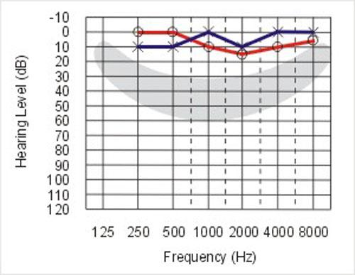 x - left, air conduction o - right, air conduction