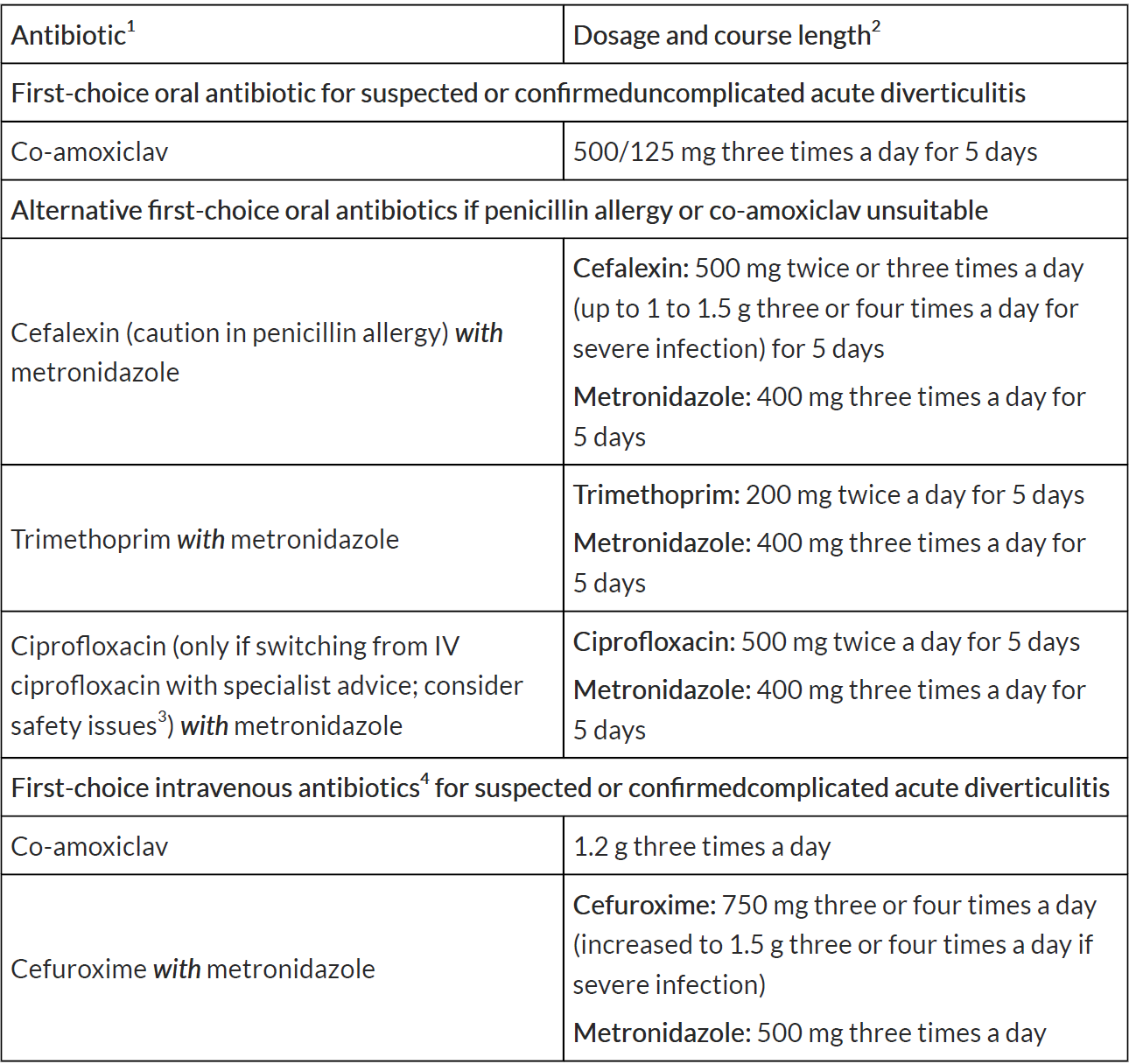 When prescribing an antibiotic for suspected or confirmed acute diverticulitis, follow the advice in table below.