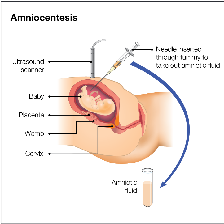 This is the technique where, under ultrasound guidance, a needle is inserted into the amniotic sac through the abdominal wall. About 15-20mls of amniotic fluid removed. The fetal loss rate is 1%. The test is done anytime from 15 completed weeks.
