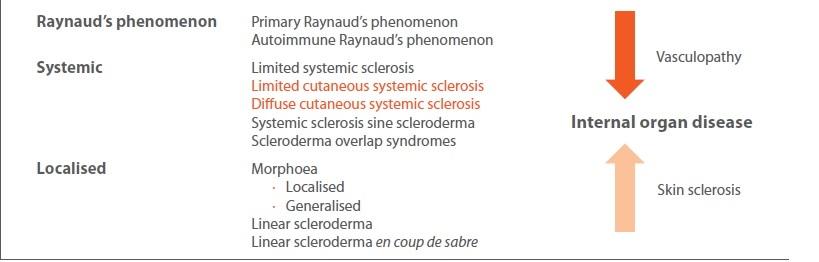Various subsets of systemic sclerosis are distinguished by the degree of involvement of the skin versus internal organs.