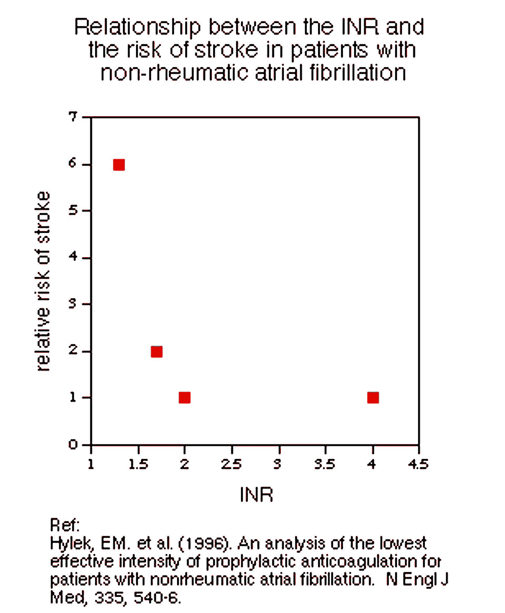 Graph showing the relationship between INR levels and relative risk of stroke in patients with non-rheumatic atrial fibrillation, sourced from a 1996 New England Journal of Medicine study.