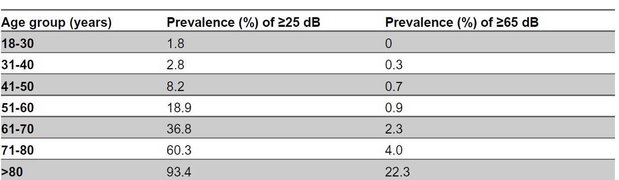 The prevalence of deafness based on age group has been stated (4):