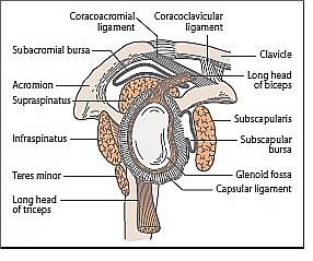 The subacromial space lies underneath the acromion, the coracoid process, the acromioclavicular joint and the coracoacromial ligament. A bursa in the subacromial space provides lubrication for the rotator cuff